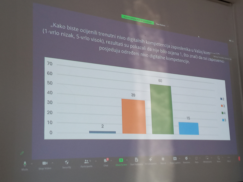 Na sastanku su predstavljeni rezultati istraživanja stavova privrednih subjekata o digitalnim kompetencijama koje trebaju posjedovati zaposlenici sa srednjom stručnom spremom. Ispitivani su predstavnici različitih sektora, ali fokus je bio na predstavnicima metalne i drvne industrije kao i turizma u Bosni i Hercegovini. Približno 60% ispitanika potvrdilo je da su digitalne kompetencije jedan od ključnih faktora za zapošljavanje u njihovoj kompaniji. Da osnovne digitalne vještine učenici/učenice trebaju steći tokom osnovnog i srednjeg obrazovanja, mišljenja je 72% ispitanika. Poslodavci naročito ističu važnost osnovnih kompjuterskih vještina koje uključuju korištenje operativnih sistema, e-mail korespondencija, pretraživanje interneta i kibernetičku sigurnost. Kao najveći izazov poslodavci su naveli da slabo pozavanje softverskih alata koji su specifični za industriju, a sa kojima bi se učenici/učenice trebali upoznati prije stupanja na tržište rada.